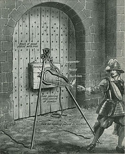 A petard was a bell or funnel shaped metal enclosure, filled with gunpowder which was braced hard against the door through which entrance was required. Fuse was lit and the petard fired, hopefully blowing a hole in the door. Once the petard is mounted in place, the marshal can count several seconds and then call hold. Anyone directly in front or behind the petard can be called dead (either from the explosion or from the petard becoming a missile in away from the door). A rough access way should then be made in the "door" of the fort (potentially opening an existing door in the fort structure or moving haybales, etc). Kill range should be agreed prior to war.
